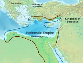 La dynastie lutte ensuite contre les Séleucides au travers les six guerres de Syrie (274 à 168) pour la domination de la Syrie-Phénicie (ou Cœlé-Syrie). L'empire lagide connait son apogée sous Ptolémée III, vainqueur des Séleucides à l'issue de la troisième guerre de Syrie (246 à 241). En 217, durant une quatrième guerre, le jeune Ptolémée IV défait Antiochos III à la bataille de Raphia ; mais en 195, Antiochos III parvient à prendre possession de la Cœlé-Syrie. Enfin, Antiochos IV remporte la sixième guerre de Syrie (170-168) ; il s'empare de Péluse, de Chypre et assiège même Alexandrie ; en dépit de ces défaites égyptiennes, la dynastie lagide est sauvée par une intervention romaine[13].