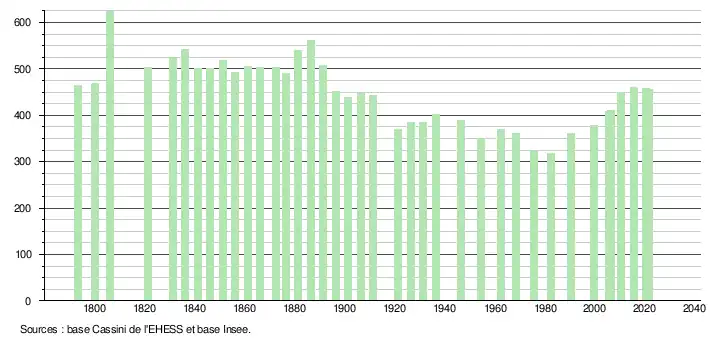 L'évolution du nombre d'habitants est connue à travers les recensements de la population effectués dans la commune depuis 1793. Pour les communes de moins de 10 000 habitants, une enquête de recensement portant sur toute la population est réalisée tous les cinq ans, les populations légales des années intermédiaires étant quant à elles estimées par interpolation ou extrapolation[20]. Pour la commune, le premier recensement exhaustif entrant dans le cadre du nouveau dispositif a été réalisé en 2005[21].