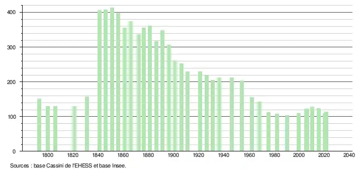 | L'évolution du nombre d'habitants est connue à travers les recensements de la population effectués dans la commune depuis 1793. Pour les communes de moins de 10 000 habitants, une enquête de recensement portant sur toute la population est réalisée tous les cinq ans, les populations légales des années intermédiaires étant quant à elles estimées par interpolation ou extrapolation[25]. Pour la commune, le premier recensement exhaustif entrant dans le cadre du nouveau dispositif a été réalisé en 2005[26]. En 2021, la commune comptait 113 habitants[Note 3], en diminution de 8,87 % par rapport à 2015 (Gers : +0,79 %, France hors Mayotte : +1,84 %). |