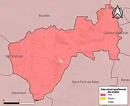 Le retrait-gonflement des sols argileux est susceptible d'engendrer des dommages importants aux bâtiments en cas d’alternance de périodes de sécheresse et de pluie. 99,9 % de la superficie communale est en aléa moyen ou fort (94,5 % au niveau départemental et 48,5 % au niveau national). Sur les 70 bâtiments dénombrés sur la commune en 2019, 70 sont en aléa moyen ou fort, soit 100 %, à comparer aux 93 % au niveau départemental et 54 % au niveau national. Une cartographie de l'exposition du territoire national au retrait gonflement des sols argileux est disponible sur le site du BRGM[22],[Carte 3].