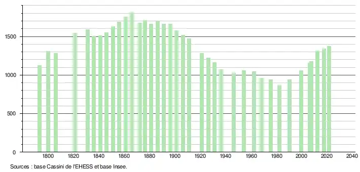 L'évolution du nombre d'habitants est connue à travers les recensements de la population effectués dans la commune depuis 1793. Pour les communes de moins de 10 000 habitants, une enquête de recensement portant sur toute la population est réalisée tous les cinq ans, les populations légales des années intermédiaires étant quant à elles estimées par interpolation ou extrapolation[29]. Pour la commune, le premier recensement exhaustif entrant dans le cadre du nouveau dispositif a été réalisé en 2007[30].