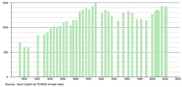 L'évolution du nombre d'habitants est connue à travers les recensements de la population effectués dans la commune depuis 1793. Pour les communes de moins de 10 000 habitants, une enquête de recensement portant sur toute la population est réalisée tous les cinq ans, les populations légales des années intermédiaires étant quant à elles estimées par interpolation ou extrapolation[14]. Pour la commune, le premier recensement exhaustif entrant dans le cadre du nouveau dispositif a été réalisé en 2004[15].