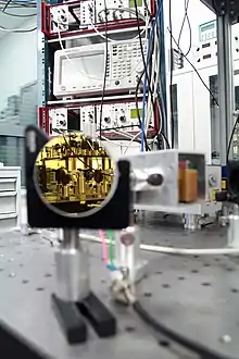 - Physique atomique : L'atome de rubidium (à la fois ses isotopes 85 et 87) est très fréquemment utilisé pour les expériences de physique atomique. En effet, certaines transitions de cet atome correspondent à des longueurs d'onde de laser classiques (780 nm pour la transition 5s-5p notamment), ce qui facilite les expériences. Entre autres, le rubidium peut être utilisé pour la construction d'horloges atomiques en utilisant la transition hyperfine de 87Rb à 6,834 682 611 GHz [8].