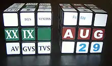 Le cube calendrier est décoré de sorte qu'il soit possible de former n'importe quelle association de jour et date sur une des faces.
