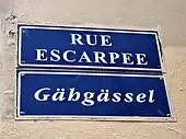 À partir de 1995, des plaques de rues bilingues, à la fois en français et en alsacien, sont mises en place par la municipalité lorsque les noms de rue traditionnels étaient encore en usage dans le parler strasbourgeois[3]. La plaque est ainsi sous-titrée Gähgässel.