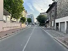 La rue Godillot à Saint-Ouen-sur-Seine, vers l'ouest. La gare de Saint-Ouen-sur-Seine est visible sur la gauche. | ||||
