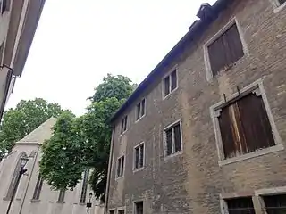 Perspective vers le grenier (à droite) et l'église Sainte-Madeleine. | |