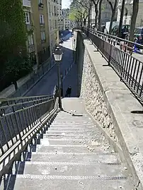 - Cette voie rejoint la rue Berton, en contrebas, à la fois par le réseau viaire traditionnel et par un escalier, décrit comme « très étroit et très raide » par le poète Guillaume Apollinaire[7].