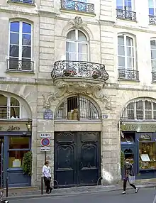 Inscrit MH (1926)[14], porte, vantaux, balcon sur rue. Ce bâtiment est contemporain de l'hôtel de Châteauvieux (no 49), les deux bâtiments ayant été construits en 1728. Le portail est couronné d'un fronton entrecoupé par des pilastres à refends de part et d'autre. Un mascaron à la tête de faune entouré de feuilles de lierre surplombe la porte. Les différents motifs ornant les consoles, le tympan et la porte s'inspirent de coquillages et de motifs de végétaux de style rocaille, en vogue sous Louis XV. La façade privilégie les lignes horizontales (un seul étage, corniches et bandeau sur toute la longueur). À droite, au fond de la cour, bâtiment en arrondi coiffé d'une coupole, un étage, combles mansardés. Ces deux hôtels comportaient des dessus-de-portes de François Boucher. À l'époque ou les deux propriétés n'en faisaient qu'une, Jacques de La Guesle, gentilhomme lettré, y demeura. Son malheur fut de servir d'introducteur à Jacques Clément dans le cabinet d'Henri III, sans se douter des projets de l'assassin. Il fut très attaché à ce roi ainsi qu'à Henri IV et mourut en 1612. Après lui, ses héritiers partagèrent la propriété. Le plus gros lot en passait du comte de Châteauvieux, qui avait épousé Marie de La Guesle, à son gendre le duc ou marquis de la Vieuville. Mais les deux parts en 1738, furent encore réunies pour quelque temps par l'adjudication de l'hôtel de Châteauvieux au profit de Renouard, comte de Villayer et d'Auteuil, conseiller du roi, maître des requêtes, qui venait dans l'autre hôtel après les du Tillet, famille de parlementaire et ecclésiastique déjà propriétaire de l'autre côté. Dans cet hôtel de Châteauvieux, on dînait en 1691 pour trente sols. Il en coûtait alors un tiers de moins pour prendre son repas au Coq-Hardi ou aux Trois-Chapelets, dans la même rue où se trouvait également l'inventeur des pâtés de jambon : un dénommé Jacquet. Le , le notaire François Brichard ouvrit ici son étude notariale n°XXIII. Il était propriétaire de l'hôtel particulier et avait pour client le peintre Quentin La Tour, le Pelletier de Saint-Fargeau, de Mouchy, de Rosambo, de Monaco, de Lorraine, de Durfort, de Vaudémont, de Duras, Sénac de Meilhan, ainsi que le duc d'Orléans, fort riche, il fut membre du Club des Cordeliers et capitaine à son bataillon, accusé de cacher des fonds d'émigré, il fut guillotiné le et ses biens vendus[21]. En 1910, l'Association philotechnique y avait ses bureaux. - No 48 : face au lycée Fénelon. Au rez-de-chaussée, boutique à droite de la porte d'entrée. Deux fenêtres sur quatre étages. Combles aménagés.