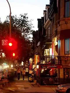 Cette rue commerçante est réputée pour ses cafés, ses terrasses, ses restaurants, ses librairies et ses boutiques spécialisées. Elle abrite notamment le Théâtre du Rideau Vert.