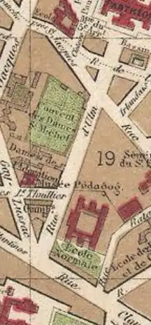 En 1870, Émile Gaboriau décrit « cette belle et large rue d'Ulm, qui commence à la place du Panthéon et se termine brusquement à la rue des Feuillantines. Les magasins y sont peu somptueux et si rares qu'on les compterait. Il y a un marchand de vin, à gauche, à l'angle de la rue de la Vieille-Estrapade, puis la petite boutique de La Jeunesse, puis une blanchisseuse et un relieur. On trouve, à droite, l'imprimerie du Bulletin de l'Observatoire, un marchand de bois nommé Chanson, un serrurier, un fruitier, un boulanger, et c'est quasi tout. Le reste de la rue est occupé par de vastes établissements à façades austères entourés de jardins. C'est le couvent des Sœurs de la Croix, et ensuite la maison des Dames de l'Adoration réparatrice du Sacré-Cœur. Plus loin, vers la rue des Feuillantines, on reconnaît l'Ecole normale, et en face un dépôt de la Compagnie des omnibus »[2].