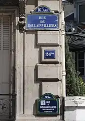 - No 29 : hameau de Boulainvilliers, voie privée à l'angle avec la rue du Ranelagh. La joueuse de tennis Suzanne Lenglen y est née en 1899[7]. Pierre Louys y a habité[8]. Fernand Gregh y a aussi vécu.