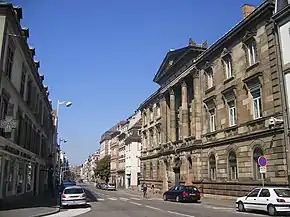 - no 14 : Les sept travées de cette façade néoclassique sont animées par un oriel situé au dessus de l'entrée. La porte et les fenêtres du rez-de-chaussée sont surmontés de cartouches figurant des têtes de lion[11]. Ancien siège du Crédit industriel d'Alsace et de Lorraine (CIAL) transféré au Wacken, l'immeuble abrite une agence du CIC.