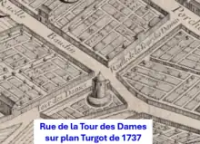 Vers 1760, elle est appelée « ruelle Baudin » puis « rue Baudin » et figure sur le plan de Deharme de 1763 avant d'apparaitre sous le nom de « rue de la Tour-des-Dames » sur le plan de Verniquet de 1789. La partie de la ruelle Baudin dans le prolongement vers l'est de l'actuelle rue de la Tour-de-Dames a disparu. La ruelle de la Tour des Dames figurant sur le plan de Turgot est l'actuelle rue de La Rochefoucauld.