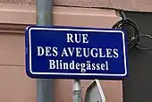 À partir de 1995, des plaques de rues bilingues, à la fois en français et en alsacien, sont mises en place par la municipalité lorsque les noms de rue traditionnels étaient encore en usage dans le parler strasbourgeois[4]. Le nom de la rue est ainsi sous-titré Blindegässel.