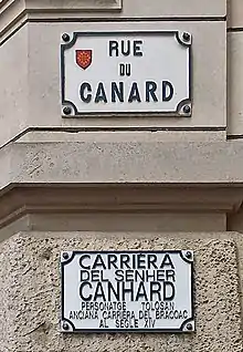 Malgré ce que semble suggérer la plaque de rue en occitan apposée dans les années 2000, la rue du Canard ne fut jamais la rue de Bracoal (carrièra de Bracoal en occitan). C'est l'actuelle impasse du Canard qui portait ce nom entre les XIVe et XVIIIe siècles[3].