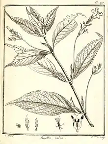 LA RUELLE rouge. (Planche 270.)Cette plante pouſſe de ſa racine des tiges hautes de quatre à cinq pieds. Elles ſont droites, noueuſes, branchues, & à quatre angles. À chaque nœud ſont placées deux feuilles oppoſées, & diſpoſées en croix. Elles ſont ſeſſiles, vertes, liſſes, ovales, légèrement dentelées à leurs bords, & terminées par une longue pointe. Les plus grandes ont ſix pouces de longueur, ſur un pouce & demi de largeur.