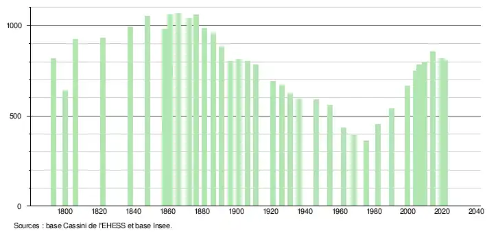 L'évolution du nombre d'habitants est connue à travers les recensements de la population effectués dans la commune depuis 1793. Pour les communes de moins de 10 000 habitants, une enquête de recensement portant sur toute la population est réalisée tous les cinq ans, les populations légales des années intermédiaires étant quant à elles estimées par interpolation ou extrapolation[15]. Pour la commune, le premier recensement exhaustif entrant dans le cadre du nouveau dispositif a été réalisé en 2004[16].