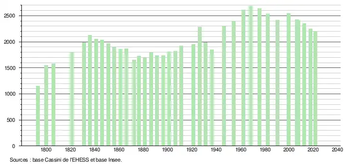 L'évolution du nombre d'habitants est connue à travers les recensements de la population effectués dans la commune depuis 1793. Pour les communes de moins de 10 000 habitants, une enquête de recensement portant sur toute la population est réalisée tous les cinq ans, les populations légales des années intermédiaires étant quant à elles estimées par interpolation ou extrapolation[32]. Pour la commune, le premier recensement exhaustif entrant dans le cadre du nouveau dispositif a été réalisé en 2007[33].