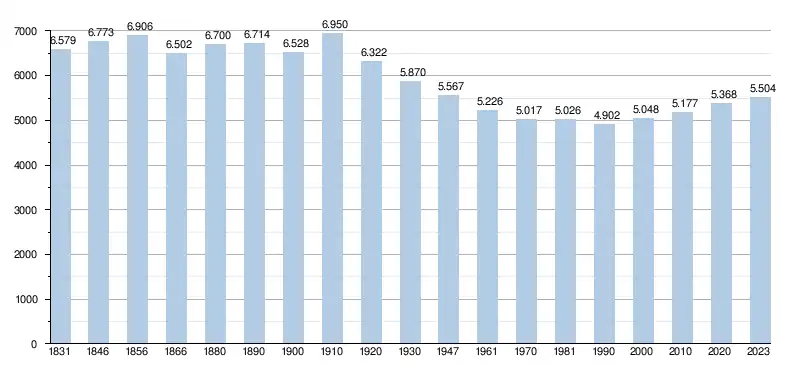 Elle comptait, au , 5 466 habitants (2 736 hommes et 2 730 femmes), soit une densité de 180,99 habitants/km²[3] pour une superficie de 30,20 km².