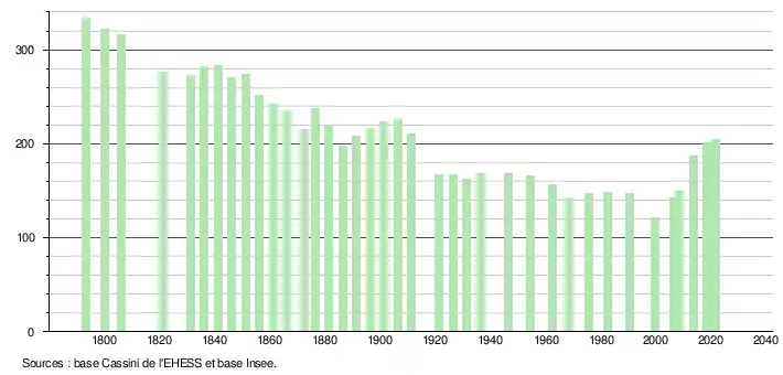 L'évolution du nombre d'habitants est connue à travers les recensements de la population effectués dans la commune depuis 1793. Pour les communes de moins de 10 000 habitants, une enquête de recensement portant sur toute la population est réalisée tous les cinq ans, les populations légales des années intermédiaires étant quant à elles estimées par interpolation ou extrapolation[41]. Pour la commune, le premier recensement exhaustif entrant dans le cadre du nouveau dispositif a été réalisé en 2008[42].