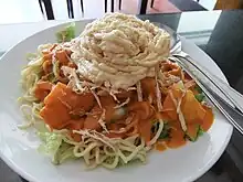 Aussi originaire de Surabaya. En plus des fruits verts, on rajoute du tofu frit, de l'ail et des tendons de bœuf à l'occasion. La sauce est toujours à base de petis avec du sucre de palme, des tranches de piments et de la sauce de soja sucrée.