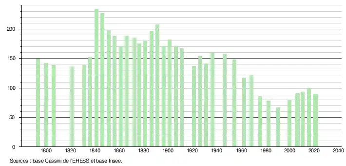L'évolution du nombre d'habitants est connue à travers les recensements de la population effectués dans la commune depuis 1793. Pour les communes de moins de 10 000 habitants, une enquête de recensement portant sur toute la population est réalisée tous les cinq ans, les populations légales des années intermédiaires étant quant à elles estimées par interpolation ou extrapolation[29]. Pour la commune, le premier recensement exhaustif entrant dans le cadre du nouveau dispositif a été réalisé en 2005[30].