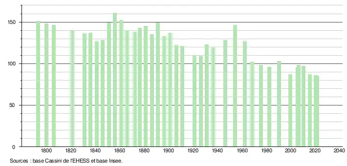 L'évolution du nombre d'habitants est connue à travers les recensements de la population effectués dans la commune depuis 1793. Pour les communes de moins de 10 000 habitants, une enquête de recensement portant sur toute la population est réalisée tous les cinq ans, les populations légales des années intermédiaires étant quant à elles estimées par interpolation ou extrapolation[19]. Pour la commune, le premier recensement exhaustif entrant dans le cadre du nouveau dispositif a été réalisé en 2005[20].
