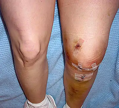 Ces symptômes ont déjà été décrits en 1879 par le Français Paul Segond (1851–1912) : forte douleur dans l'intérieur du genou et saignement intérieur rapide avec enflure correspondante de l'articulation[77]. La cause de ces symptômes est la lésion des fibres nerveuses et des vaisseaux qui courent le long des ligaments. Les premières déclenchent une douleur lors de la déchirure, et les secondes créent l'hémorragie interne de l'articulation.