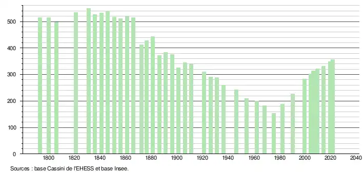 L'évolution du nombre d'habitants est connue à travers les recensements de la population effectués dans la commune depuis 1793. Pour les communes de moins de 10 000 habitants, une enquête de recensement portant sur toute la population est réalisée tous les cinq ans, les populations légales des années intermédiaires étant quant à elles estimées par interpolation ou extrapolation[18]. Pour la commune, le premier recensement exhaustif entrant dans le cadre du nouveau dispositif a été réalisé en 2004[19].