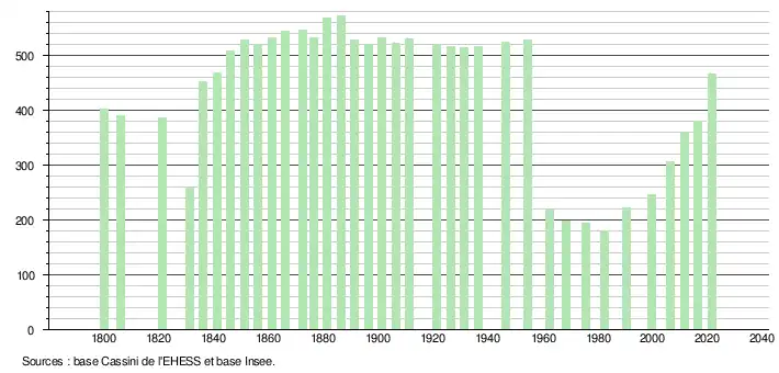 L'évolution du nombre d'habitants est connue à travers les recensements de la population effectués dans la commune depuis 1800. Pour les communes de moins de 10 000 habitants, une enquête de recensement portant sur toute la population est réalisée tous les cinq ans, les populations légales des années intermédiaires étant quant à elles estimées par interpolation ou extrapolation[16]. Pour la commune, le premier recensement exhaustif entrant dans le cadre du nouveau dispositif a été réalisé en 2006[17].