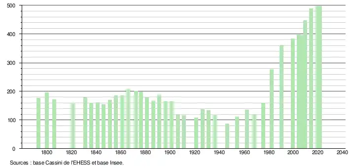 L'évolution du nombre d'habitants est connue à travers les recensements de la population effectués dans la commune depuis 1793. Pour les communes de moins de 10 000 habitants, une enquête de recensement portant sur toute la population est réalisée tous les cinq ans, les populations légales des années intermédiaires étant quant à elles estimées par interpolation ou extrapolation[16]. Pour la commune, le premier recensement exhaustif entrant dans le cadre du nouveau dispositif a été réalisé en 2004[17].