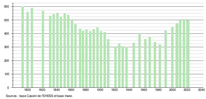 L'évolution du nombre d'habitants est connue à travers les recensements de la population effectués dans la commune depuis 1793. Pour les communes de moins de 10 000 habitants, une enquête de recensement portant sur toute la population est réalisée tous les cinq ans, les populations légales des années intermédiaires étant quant à elles estimées par interpolation ou extrapolation[20]. Pour la commune, le premier recensement exhaustif entrant dans le cadre du nouveau dispositif a été réalisé en 2005[21].