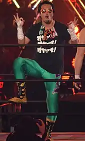 - Front dropkick[39], parfois depuis le haut du coin de ring[39]