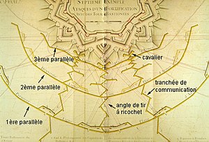 - il procède selon un système de larges tranchées parallèles et sinueuses pour éviter le tir des assiégés et permettre une progression méthodique et efficace des troupes, la moins dangereuse pour elles