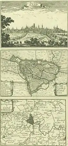 - la représentation en projection, ou plan véritable, d'une ville et ses fortifications (Figure 3 - vue intermédiaire: Ville de Gand). La figure 3 consiste par ailleurs en une représentation simultanée de la carte de la petite région, du plan de ville, et de sa représentation en perspective.