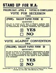 Le , le Premier ministre nationaliste, Sir James Mitchell, fit tenir un référendum sur la sécession, en parallèle de l'élection parlementaire. Les nationaliste firent campagne en faveur de la sécession tandis que le parti travailliste s'opposait à la scission de la fédération. 68 % des 237 198 votants se prononcèrent en faveur de la sécession, mais, dans le même temps, les nationalistes furent défaits. Seules les zones minières, peuplées par des fédéralistes enthousiastes, votèrent contre la scission.