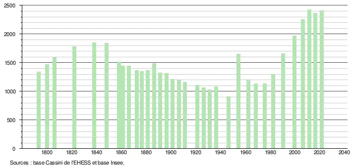 L'évolution du nombre d'habitants est connue à travers les recensements de la population effectués dans la commune depuis 1793. Pour les communes de moins de 10 000 habitants, une enquête de recensement portant sur toute la population est réalisée tous les cinq ans, les populations légales des années intermédiaires étant quant à elles estimées par interpolation ou extrapolation[25]. Pour la commune, le premier recensement exhaustif entrant dans le cadre du nouveau dispositif a été réalisé en 2006[26].