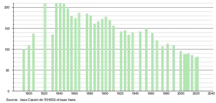 | L'évolution du nombre d'habitants est connue à travers les recensements de la population effectués dans la commune depuis 1793. Pour les communes de moins de 10 000 habitants, une enquête de recensement portant sur toute la population est réalisée tous les cinq ans, les populations légales des années intermédiaires étant quant à elles estimées par interpolation ou extrapolation[30]. Pour la commune, le premier recensement exhaustif entrant dans le cadre du nouveau dispositif a été réalisé en 2004[31]. En 2021, la commune comptait 82 habitants[Note 4], en diminution de 2,38 % par rapport à 2015 (Hautes-Pyrénées : +1,04 %, France hors Mayotte : +1,84 %). |