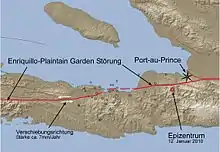 Selon le CNRS (), si la profondeur se situait entre 10 et 13 km[1],[2], la faille « Enriquillo-Plaintain garden » qui traverse l'île d'ouest en est et portant le séisme, passe à km au sud de la capitale. L'épicentre se situant à une vingtaine de kilomètres à l'ouest de la capitale, le glissement cosismique de 1 à m se serait produit sur 70 km de long[12].