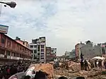La tour Bhimsen, reconstruite en 1936, s'est effondrée, de même que les monuments de la Place du Darbâr, inscrits au patrimoine mondial de l'UNESCO. Une dizaine de corps ont été extraits de ces décombres. Selon les médias locaux, une cinquantaine de personnes se trouvaient à l'intérieur au moment du drame. Le ministre de l'Information népalais annonce que les villes de Bhaktapur et de Gorkha ainsi que le district de Lamjung sont également touchés.