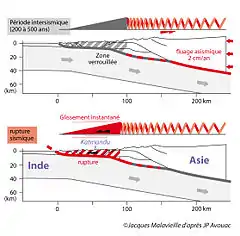 Il en résulte un cycle sismique complexe[9] : entre deux séismes, la partie la plus superficielle du chevauchement est bloquée, alors que la partie la plus profonde glisse à 2 cm/an de façon asismique. Au cours des années la contrainte s’accumule à la base de la partie bloquée, jusqu’à ce que la friction sur le plan de faille ne puisse plus s’opposer au glissement. La faille glisse alors brutalement relâchant la déformation élastique accumulée dans la croûte supérieure, comme lors du séisme du . La magnitude (énergie dégagée) du séisme produit est directement corrélée à la taille de la zone qui a rompu.