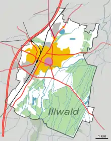 La commune dispose d'un réseau hydrographique très dense, particulièrement dans sa moitié sud-est, soit au niveau de la forêt de l'Illwald. Ce réseau comprend près de 150 km de rivières et de fossés et forme un système complexe, composé de l'Ill et ses affluents ainsi que ses diffluences[E 1]. Il est caractéristique du Grand Ried : un ensemble de prés inondables et de forêts galeries qui s'étend de Strasbourg à Colmar, entre l'Ill et le Rhin[10]. Cette zone joue un rôle de déversoir naturel en période de crue et permet l'épuration des eaux de surface[E 2].