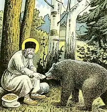 Saint Séraphin coiffé d'un chamilauque et auréolé de sainteté, nourrit un ours à l'extérieur de son ermitage.