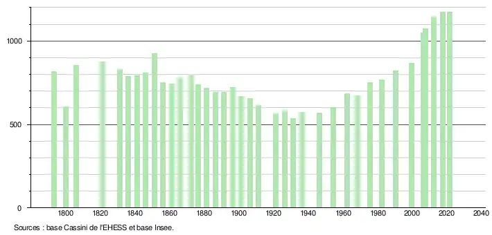 L'évolution du nombre d'habitants est connue à travers les recensements de la population effectués dans la commune depuis 1793. Pour les communes de moins de 10 000 habitants, une enquête de recensement portant sur toute la population est réalisée tous les cinq ans, les populations légales des années intermédiaires étant quant à elles estimées par interpolation ou extrapolation[25]. Pour la commune, le premier recensement exhaustif entrant dans le cadre du nouveau dispositif a été réalisé en 2007[26].
