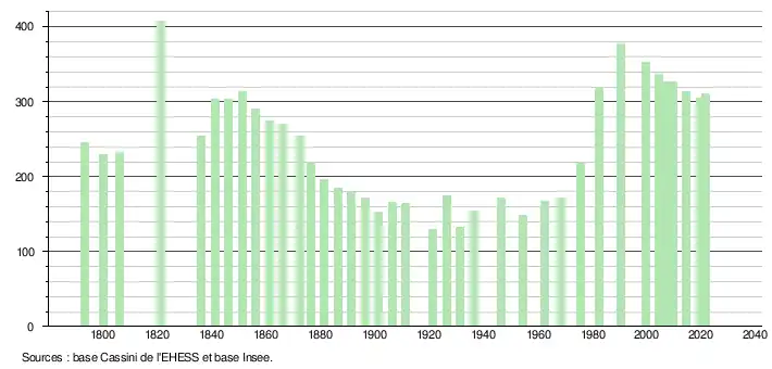 L'évolution du nombre d'habitants est connue à travers les recensements de la population effectués dans la commune depuis 1793. Pour les communes de moins de 10 000 habitants, une enquête de recensement portant sur toute la population est réalisée tous les cinq ans, les populations légales des années intermédiaires étant quant à elles estimées par interpolation ou extrapolation[23]. Pour la commune, le premier recensement exhaustif entrant dans le cadre du nouveau dispositif a été réalisé en 2004[24].