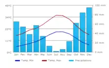 | Précipitations (mm) | 65,7 | 49,9 | 35,8 | 54 | 30,5 | 9,9 | 2,4 | 5,3 | 26,9 | 68,3 | 91,1 | 99 | 538,8 |