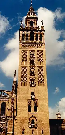 La ville finit par être conquise par Ferdinand III de Castille, lors du siège de Séville[13] qui s'acheva le après 18 mois de siège et d'offensives tant terrestres que fluviales. Après cette conquête les rois et le clergé catholique veulent peu à peu remodeler la ville : destruction de la mosquée, remplacée par une cathédrale (que l'on veut l'une des plus vastes de la chrétienté), construction de nouveaux palais, d'églises et de couvents. En revanche la judería change peu. Si la capitale du royaume de Castille est Burgos, la cour est en fait itinérante, et de nombreux souverains prennent plaisir à séjourner plus ou moins durablement à Séville (dont Alphonse X le Sage, Pierre Ier le Cruel). Cela stimule l'activité du bâtiment, l'artisanat d'art, la vie culturelle. Grâce à l'irrigation développée par les Arabes, les campagnes de la région sont florissantes. Comme les navires de l'époque ont un faible tirant d'eau, on peut embarquer à Séville pour les navigations océanes (Vespucci, Magellan). La cité est débordante de vie, et Isabelle la Catholique crée une Bourse du commerce en 1503. On a peut-être exagéré l'importance de Séville en lui attribuant alors 400 000 habitants, mais, même si elle n'en comporte que 200 000, c'est l'une des plus grandes villes du monde de cette époque.