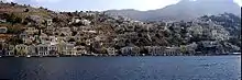 La ville principale, également appelée Symi, est située sur la côte nord-est et regroupe la majorité des 2 560 habitants de l'île qui vivent principalement de la pêche, du commerce et du tourisme,la population de l'île décuple alors en haute saison et se voit compter plus de 25 000 habitants.