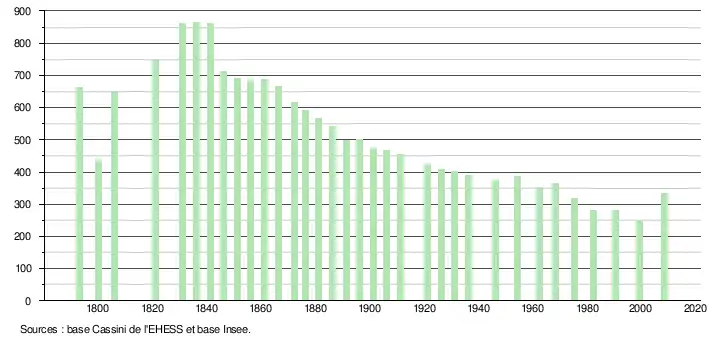 L'évolution du nombre d'habitants est connue à travers les recensements de la population effectués dans la commune depuis 1793. À partir du , les populations légales des communes sont publiées annuellement dans le cadre d'un recensement qui repose désormais sur une collecte d'information annuelle, concernant successivement tous les territoires communaux au cours d'une période de cinq ans. Pour les communes de moins de 10 000 habitants, une enquête de recensement portant sur toute la population est réalisée tous les cinq ans, les populations légales des années intermédiaires étant quant à elles estimées par interpolation ou extrapolation[24]. Pour la commune, le premier recensement exhaustif entrant dans le cadre du nouveau dispositif a été réalisé en 2008[25],[Note 1].